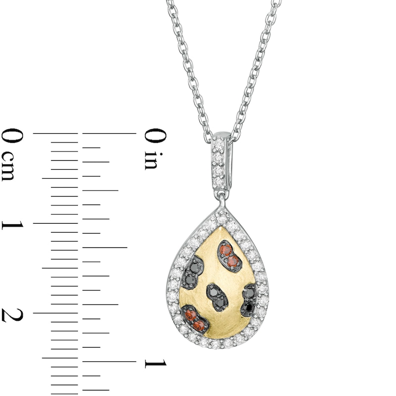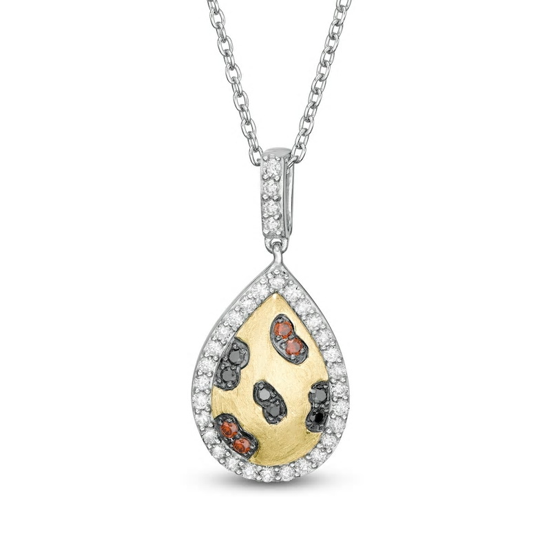 Created in sterling silver and warm 10K gold, this teardrop-shaped design showcases a brush-textured yellow gold surrounded in a silver frame of white diamonds. A nod to Cheetah, alluring enhanced black and enhanced champagne diamond "spots" add chic pattern. Captivating with 1/3 ct. t.w. of diamonds and a bright polished shine, this pendant suspends along an 18.0-inch cable chain that secures with a spring-ring clasp.This exclusive fine jewelry collection inspires you to wear your strength, confidence and power.